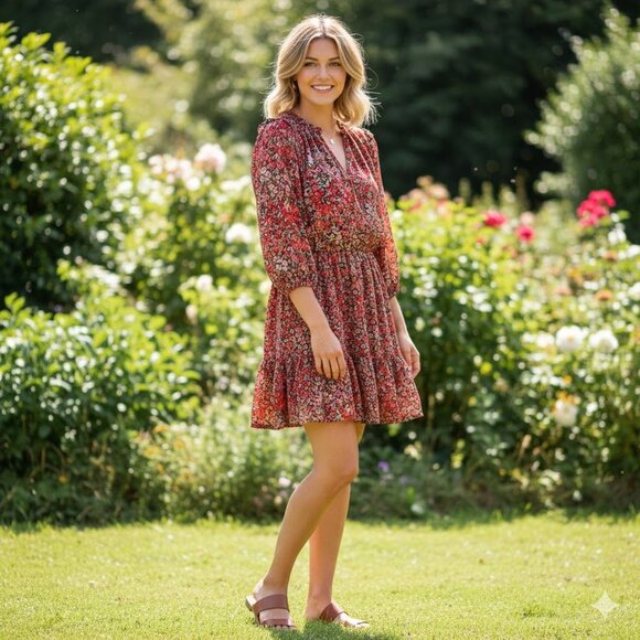 This dress exudes a romantic charm with its vibrant red floral pattern, featuring long sleeves and a flowing silhouette. Crafted by Lauren Conrad, it combines comfort and elegance, ensuring it is a versatile addition. Its polyester material and thoughtful design make it ideal for numerous occasions, embodying both style and practicality.