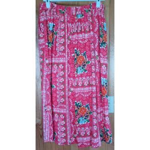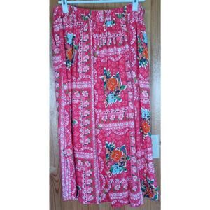 Lauren Conrad Red Floral Midi Skirt Linen Blend Women's 14 Elastic Waist Fairy