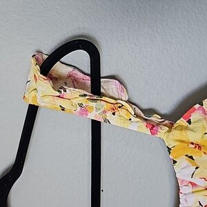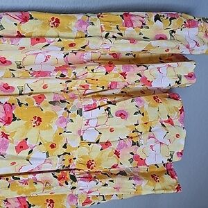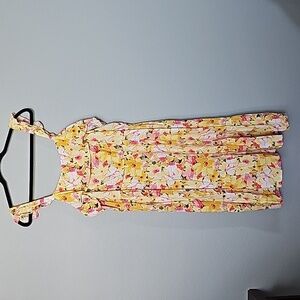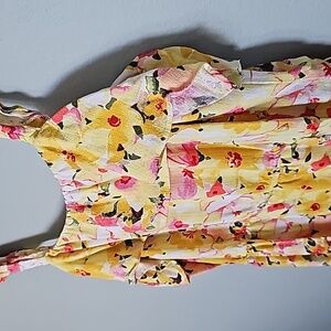 Yellow dress with pink and orange floral details. Cute little ruffle strap at the shoulder. Stretches across the chest and back. Tiered look. Great condition. Small ruffle across the chest. Spring summer picnic, easter , brunch, church, weekend, hang out, vacation, relaxed, fun, shower, vibrant, girly, resort, cottage, garden, dainty
