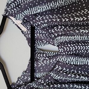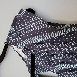 Black with mint colored pattern. Has cute heart, dot and line print. Cap sleeves. Ties behind the neck. Lightweight semi sheer fabric that doesn't stretch. There are some runs in the fabric at the chest, see close ups. Pleats around the neckline. Office, workplace, career, brunch, teacher, feminine, going out, spring, summer, dinner, cute, goth