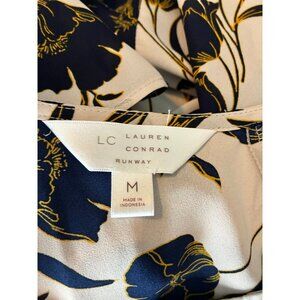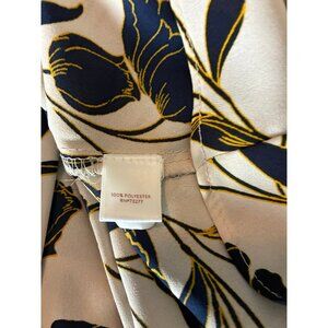 Elevate your wardrobe with this elegant Lauren Conrad women's top featuring a sophisticated floral pattern in navy and gold tones on a soft beige background. Crafted from 100% polyester, the fabric offers a smooth texture and comfortable fit, perfect for everyday wear or special occasions. The medium size provides a relaxed yet flattering silhouette with a regular fit.