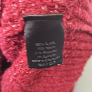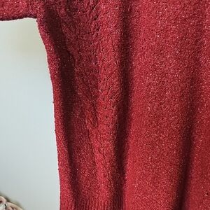 Warm and stylish red knit sweater. Perfect for any casual outing. Thin and stretchy fabric. Cozycore. Has a speckled fabric. Cable knit design down the sleeves and the sides of the sweater. Longer length. Dress it up for the office or down for the weekend or hanging out. Brunch, office, workplace, winter, cozy, cuddle, comfy, comfort, vamp, goth, normcore, girly, feminine, VSCO