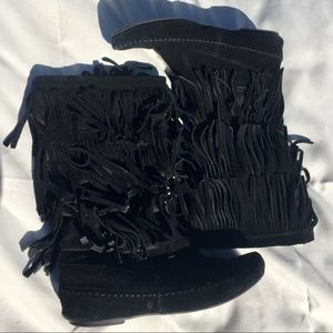 These are so fun! These are very similar to Minnetonka’s fringe boots, but these fit bigger calves more comfortably. Wear them up or slouched, very comfortable soles as well!