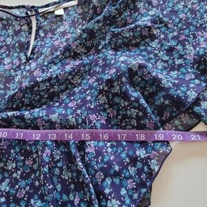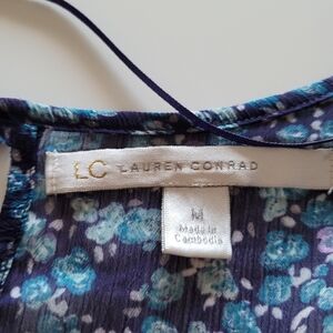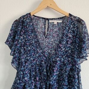 This Lauren Conrad floral chiffon ruffle top is a great addition to any wardrobe. Has general wear, please see photos for details. Approximate length & chest measurements are provided in photos.