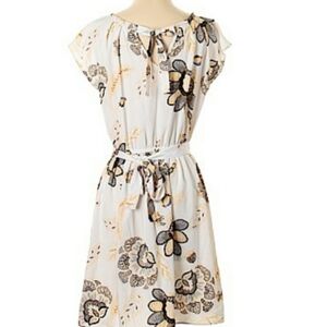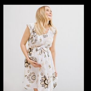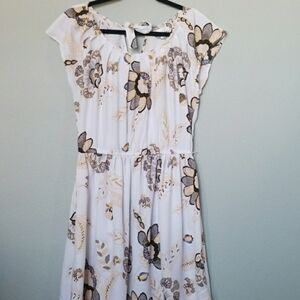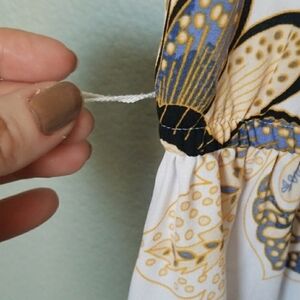 Soooo pretty! Its a bright white with yellow, blue and black tone flowers. Ties behind the neck, elastic at the waist, belt loops but no belt. There is a faint yellow stain on the front bottom right side, see close up its very hard to see in my opinion. Smoke free home. Has a ruffle detail around the neck. No stretch. Cap sleeves. Feminine, soft girl, spring, summer, romantic, flirty girly, brunch, church, garden, cottage