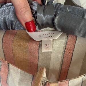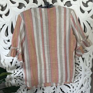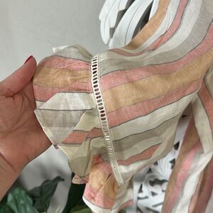 Pretty Linen Cotton blend top. Like new condition. Never washed. Size is XS but would fit small too due to boxier fit. Ruffle hem on sleeve. Pleating detail on front. Perfect for Spring and Summer.