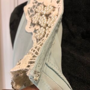 Lauren Conrad soft blue sheer sleeveless top w/ crocheted collar and pearl and bead flowers. Front closure with hook. Size medium, length 24in, pit to pit 19in. A few loose threads but still in good condition 🌸🌸🌸