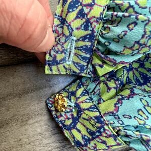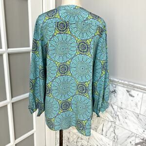 Add a touch of effortless elegance to your wardrobe with this stunning Lauren Gold silk blouse. Crafted from luxurious 100% silk, it features a vibrant mandala-inspired print in shades of aqua blue, lime green, and deep purple. The flattering split V-neckline is finished with a delicate tie detail, while the relaxed, flowy silhouette offers both comfort and style.