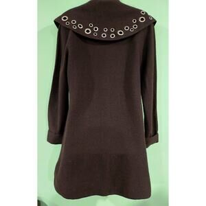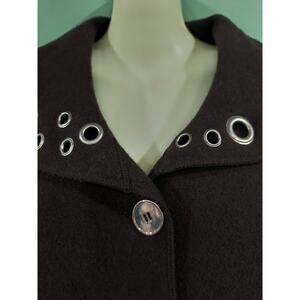 Elevate your wardrobe with this unique Lauren Hansen Studio boiled wool jacket! This stylish brown jacket features a distinctive large collar and eye-catching decorative grommets. It also has large shiny silver buttons, adding a touch of edgy sophistication to any outfit.