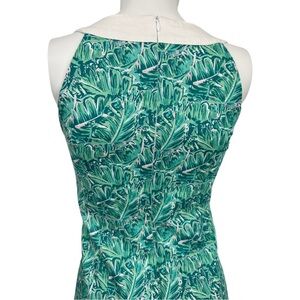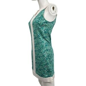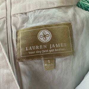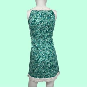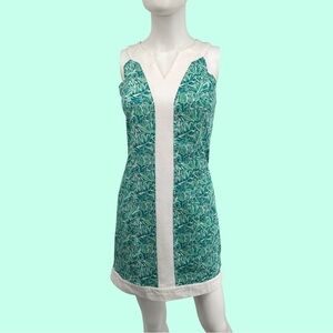 Lauren James Shift Style Mod Floral Dress. Pretty teal and turquoise colors with a hint of pink on white background. Invisible zipper up the back. Lined in white. Lining is sewn in so you don’t have to pull at your slip all day. White trim gives it a 60s feel. Size Small. Fits my size 4 mannequin well! Happy to give measurements upon request!