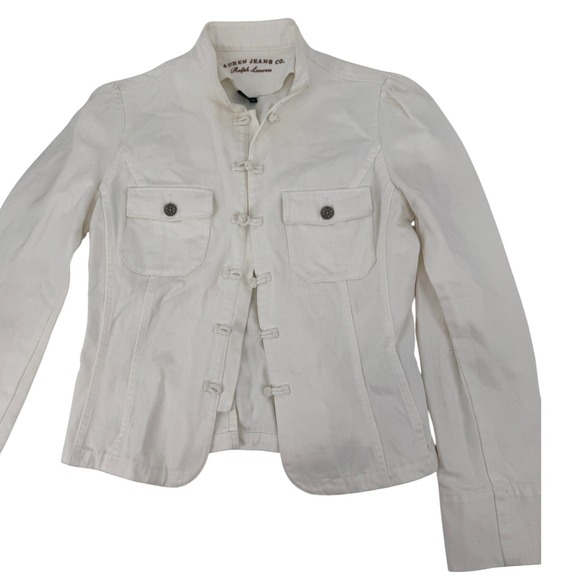 A white jacket from Lauren Jeans Co Ralph Lauren with a mandarin collar and unique frog button closures. This stylish jacket features two chest pockets with button closures and a fitted silhouette. Perfect for a sophisticated casual look or a chic evening out.