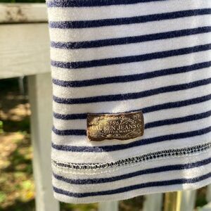 - Classic nautical 100% cotton navy blue white striped round neck long sleeve knit top with brown faux suede elbow patch and suede zipper detail at left shoulder by Lauren Jeans Company by Ralph Lauren