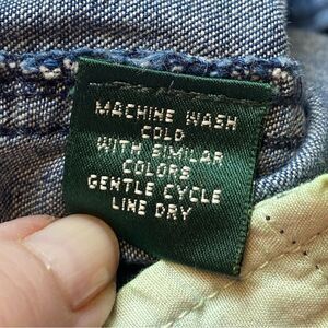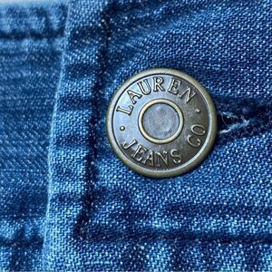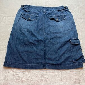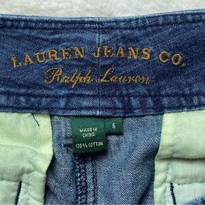 Lauren Jeans Co Ralph Lauren Blue Denim Skirt Size 6. Excellent used condition. Front button and zipper closure. Side tabs to adjust fit. 2 front and 2 back button pockets. Measures waist 31", length 19".