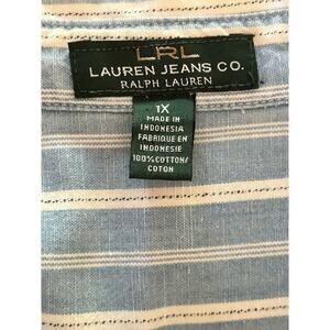 LRL Lauren Jeans Co. Ralph Lauren button front blouse, chambray striped shirt, plus size 1X top, coastal cowgirl, Americana classic, timeless casual cotton