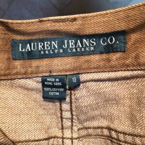 Leather label on the back that says, Authentic Denim Outfitters, Est 1967 (with picture of horse), Lauren Jeans Co, Ralph Lauren