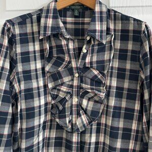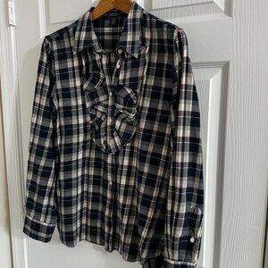 Blue/Beige Plaid, Ruffled Front, 100% Cotton, Long Sleeve.