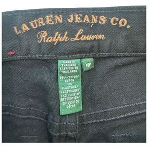 Keywords: Lauren Jeans Co., Ralph Lauren, bootcut jeans, size 10, petites, women's jeans, black denim, mid-rise, classic fit, embroidered logo, 5-pocket styling, dark wash, machine washable, pre-owned.
