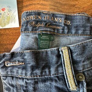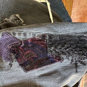 Stylish vintage Lauren Jeans Co, Ralph Lauren, 99% cotton, 1% elastane, 5 pocket jeans in off black with two areas of multi-color velvet appliques plus other embellishment as shown. Very good preowned condition.