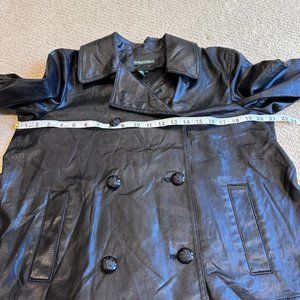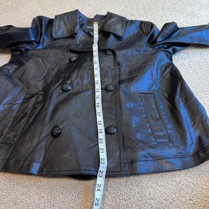 Lauren Jeans Co. Jacket Coated Denim Coat Women's Medium Double Breasted Black. Large logo buttons. Collar and lapels. 3/4 sleeves with decorative strap and button. Front pockets. Unlined.