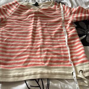 Stay stylish and comfortable with this striped coral and white sweater. Side drawstring at the waist. In great used condition, no flaws or damage to note.