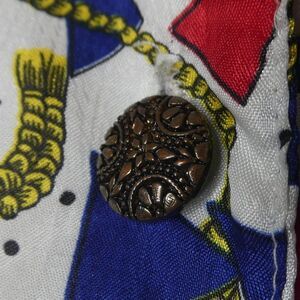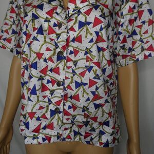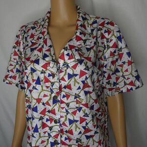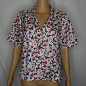 Beautiful white button up shirt. Vintage with short sleeves, fancy detailed buttons, shoulder pads, and all-over nautrical rop and triangle polka dot print. In excellent condition, no size/material tags. See measurements below.