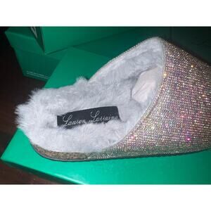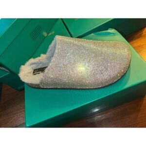 Material: plush interior, bedazzled exterior, cork with rubber tread overlay for sole