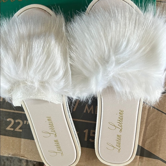 Elegant cream fur slippers by Lauren Lorraine. Perfect for cozy style.