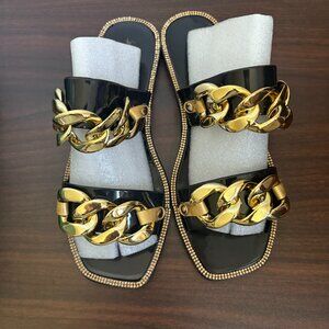 Lauren Lorraine Shoes Women's Chan Black Chain Slide Sandals Flats Gold Size 5.5