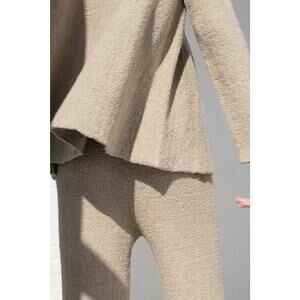 Bring the cozy with you anywhere you go (and in any weather) with this stunning knit set from Lauren Manoogian. Worn once and dry cleaned (no flaws, imperfections or noticeable wear), this amazing set is made from a super soft horizontally knit 75% Pima Cotton / 15% Nylon / 10% Elastane blend that has a subtle and organic nubby bouclé texture. The New Miter pants are a LM fave and feature a slight flare at the bottom hem and a wide hidden elastic waistband. The top features an A-line silhouette with a classic boat neck detail and a swingy fit. The color, "Pumice" is a light to medium neutral taupe (best represented by my pics where this is hanging on the hangers, IMO). Made in Peru. Handwash or dry clean. Designer size 3 (Large). Retailed for $800 without tax ($410 for the top; $390 for the pants).