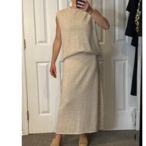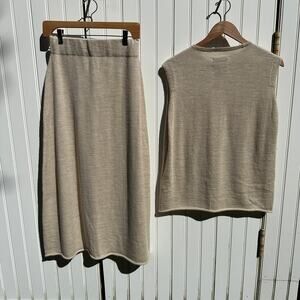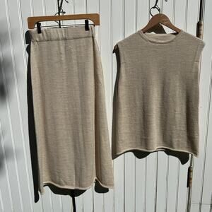 Lauren Manoogian's Base Shell and Midi Skirt set is so versatile, comfy, and warm. Easy to dress up or down, this beautiful set is knit from a lightweight 70% Baby Alpaca / 30% Merino Wool in "Ecru Slub", a natural based yarn with subtle grey heathering (outdoor hanger pics best represent the actual color IMO). The "Midi Skirt" (I am short; it is longer on me) with a hidden elastic waistband, a rolled edge bottom hem, and an relaxed fit with an a-line silhouette. The "Base Shell" features a crewneck with a clean finish, rolled hemline and a relaxed fit. Size 1 (Small). Dry clean or hand wash. Made in Peru. Retailed for $620. Worn twice; in excellent pre-owned condition. No flaws.