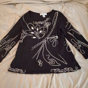 Lauren Michelle women's bold black and white embroidered graphic design blouse. Size PM. Pit to pit measures 18 inches. Length 22 inches.