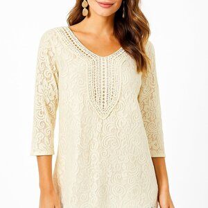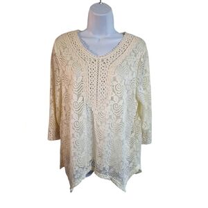 Lauren Michelle women’s large blouse in ivory lace with full lining and a romantic sharkbite hem. Features a beautiful crochet-style neckline and flattering flowy fit. Perfect for cottagecore, peasant, or boho-inspired outfits. Excellent condition, no flaws.