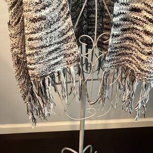 This cozy wrap from Lauren Michelle is a soft gray and white. Large deep pockets to store your keys and phone. Fringed hem.