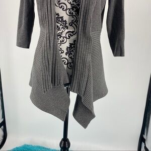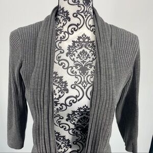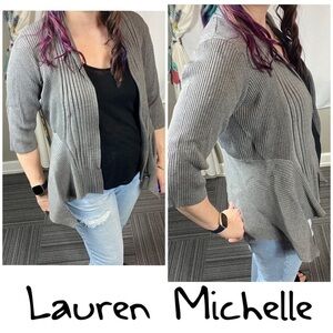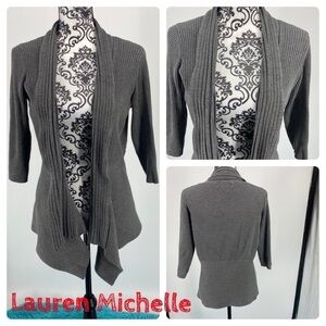 Lauren Michelle gray ribbed open front cardigan. Fold over lapel. 80% acrylic 18% nylon, 2% spandex. Size XL.