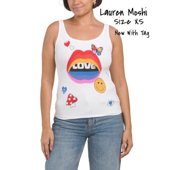 Lauren Moshi Rainbow Lips Tank Top Tee - XS White Love, New with Tags