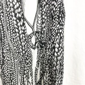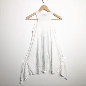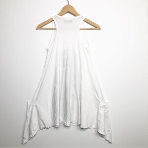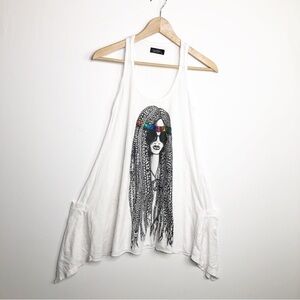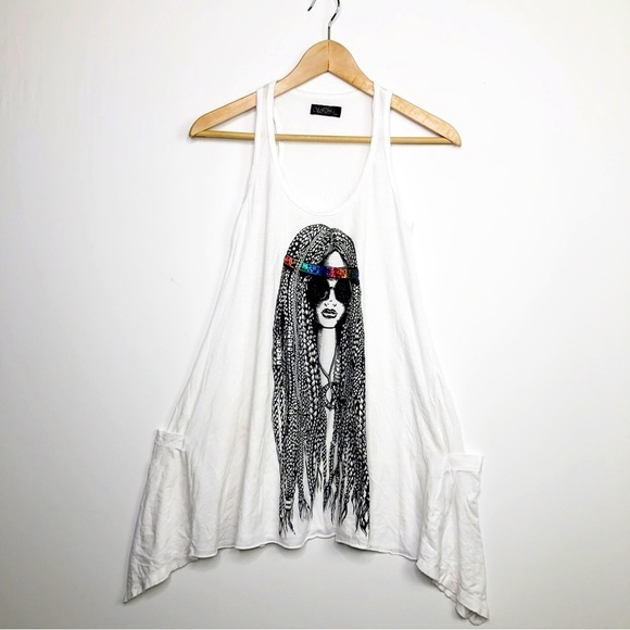 Lauren Moshi white graphic bohemian razorback T-shirt, graphics of a hippie girl with braids and rainbow headband with a peace sign necklace, With pockets.
