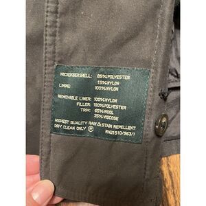 This is a classic, handsome mid length trench or barn type coat with a button in wool zip up vest. This coat is missing a button and can use a dry clean. No stains or holes! Smoke free home. See photos for condition and measurements.