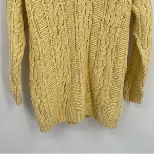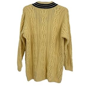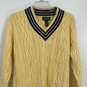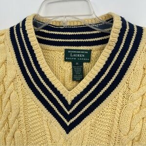 Lauren RALPH LAUREN Yellow/Navy Hand Knit Cotton Tennis Sweater Womens Size M. 100% cotton. Triple stripe neckline. Cable knit. V neck. Long sleeves. Rib knit trim. Bust 46. Length 29. Measurements are approximate. Heavyweight. Very good preowned condition.
