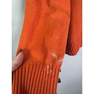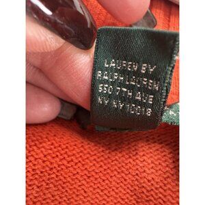 This vibrant Lauren Ralph Lauren sweater is the perfect cozy piece for the Autumn aesthetic. It features a chic funnel neck with decorative green buttons and a soft, comfortable knit in a striking orange color. The classic silhouette makes it a timeless layering piece. It is a Women's size 2X, made from 100% cotton in China. It is inGood pre-owned condition - staining throughout - see photos for details. The flat-lay measurements are: a pit to pit of 23 inches and a length of 27 inches.