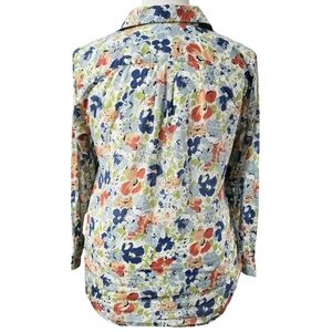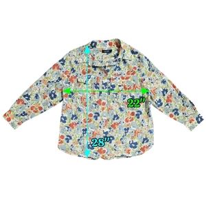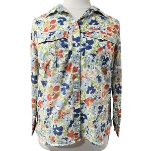 Good used condition, with no outside stains or tears. A multicolor floral button-up shirt, with flap chest pockets. Romantic and whimsical. Comfortable and breathable as it is pure cotton.