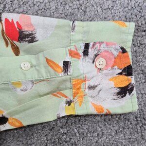 Good used condition, with no stains or tears. A light green floral button-up shirt, with chest flap pockets. Comfortable and breathable as it is pure cotton.