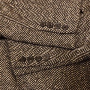 Style: Blazer style, warm 100% lamb's wool, herringbone pattern jacket with black leather zipper-pull stamped Lauren (see photos), faux pockets one each side lower front and one faux breast pocket on left, four faux buttons at the end of sleeves/wrist, band across the lower back for added style
