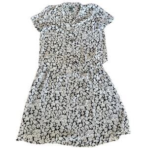 100% silk set from Lauren Ralph Lauren, featuring a navy and white floral print with subtle sheen and fluid drape. The button-front short sleeve blouse has a relaxed silhouette and soft collar, while the coordinating side-button skirt falls gracefully to a mid-length hem. Fully lined for comfort and coverage — ideal for warm weather occasions, resort wear, or timeless vintage-inspired styling.