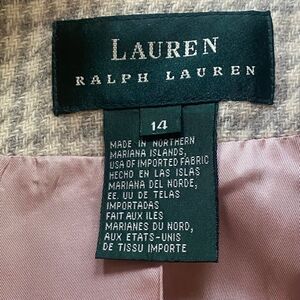 Elegant and timeless, this Lauren Ralph Lauren jacket features a refined ivory and gray houndstooth pattern crafted in pure wool. Fully lined in a soft blush pink satin for comfort and sophistication. Tailored with a flattering fit and finished with a front zip closure and flap pockets — a perfect piece for polished everyday wear or professional settings.Details:Brand: Lauren Ralph LaurenSize: 14 (Women’s)Color: Ivory and grayPattern: HoundstoothMaterial: 100% Wool (outer shell)Lining: Satin-finish polyester (pale pink)Closure: Front zipper with hidden placketFeatures:Collared necklineTwo front flap pockets + one chest welt pocketFully lined interiorTailored back seam for shapeCare: Dry clean onlyMade in Northern Mariana Islands, USA of imported fabricMeasurements (approx.):Chest (pit to pit): 21"Length: 27"Sleeve: 24.5"Condition: Excellent pre-owned condition. Clean and well-maintained — no visible flaws.Style Notes:A sophisticated classic that pairs beautifully with trousers, denim, or skirts. Ideal for fall and winter — timeless Ralph Lauren elegance.