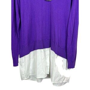 Color: Vibrant purple knit with crisp white shirt hem and collar