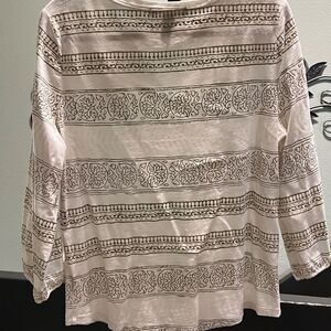 Stylish women's top featuring a chic white and brown pattern. Perfect for casual outings or a day at the office. Length 23”, pit to pit 20”