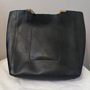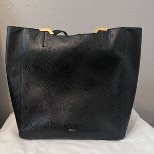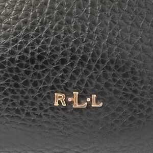 Women’s ‘Acadia’ faux leather tote bag with cut-out details from Lauren Ralph Lauren. Crafted from textured vegan leather that features an internal magnetic dot closure. Black pebble outer material, unlined, inside drop pocket and also an outside pocket. The ‘Acadia’ tote is complete with protective gold metallic feet, gold-tone metallic Lauren Ralph Lauren monogram on the front. Dim: 17” wide, 14” tall, 5” deep. 9.5” handle drop.