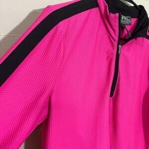 Lauren Ralph Lauren Active Quarter Zip Pullover SZ L Pink with black stripe going dow sleeve Textured material Excellent Pre-Owned Condition Measurements when laid flat Chest - 19in Length 27in Sleeve Length 26in