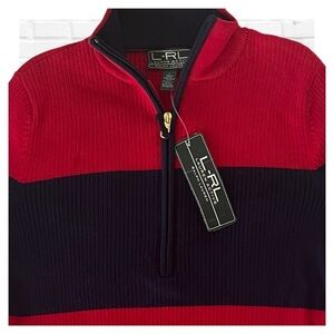 This is a beautiful half zip front sweater by Ralph Lauren. It features a mock turtleneck, half zip front, ribbed knit, in a juicy red color with a navy blue stripe across the chest and upper arms. It has great stretch and it is new with tag.