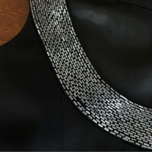 Chic black dress featuring stunning silver accents around the neckline. Perfect for evening wear.